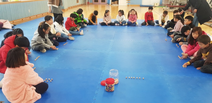아이들이 정렬된 자세로 파란 매트 위에 앉아서 공기놀이 규칙과 숫자의 덧셈뺄셈 놀이로 진행한다는것을 알았어요
