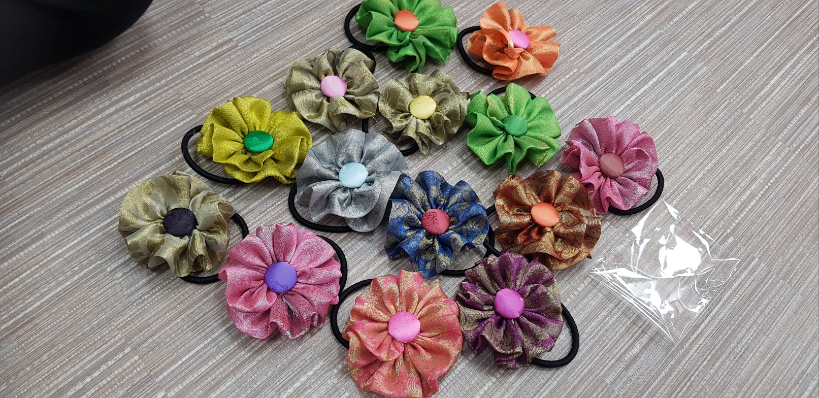 한복을 만들다 보면 예쁜 색과 무늬의 자투리천이 많이 남아요. 그동안은 그냥 ‘남은 것’이라 여겨졌지만— 이제는 그 조각들이 세상에서 가장 예쁜 꽃머리끈으로 피어나고 있어요.