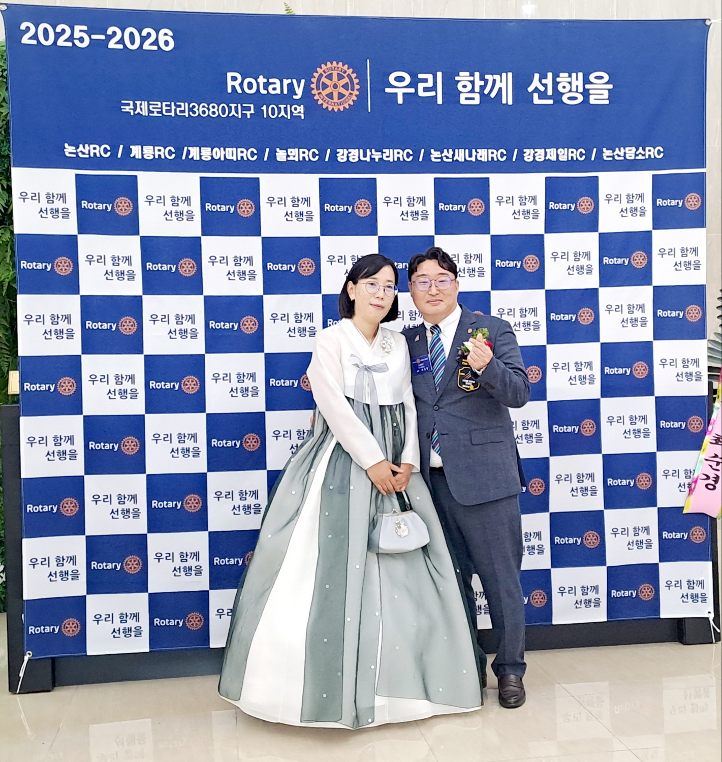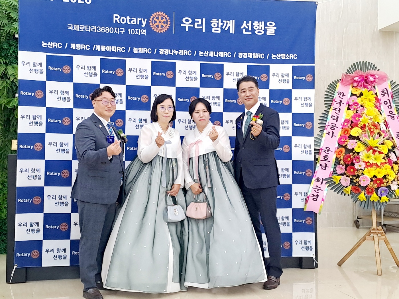 행사장 입구에는 논산RC를 비롯해 계룡RC, 놀뫼RC, 강경나누리RC 등 10개 로타리클럽 이름이 적힌 포토존이 마련되어 있었고 정장을 입은 회원님들과 한복을 곱게 차려입은 사모님들이 함께 서 있는 모습은 세대와 역할을 넘어 하나로 연결된 공동체의 상징처럼 느껴졌다.