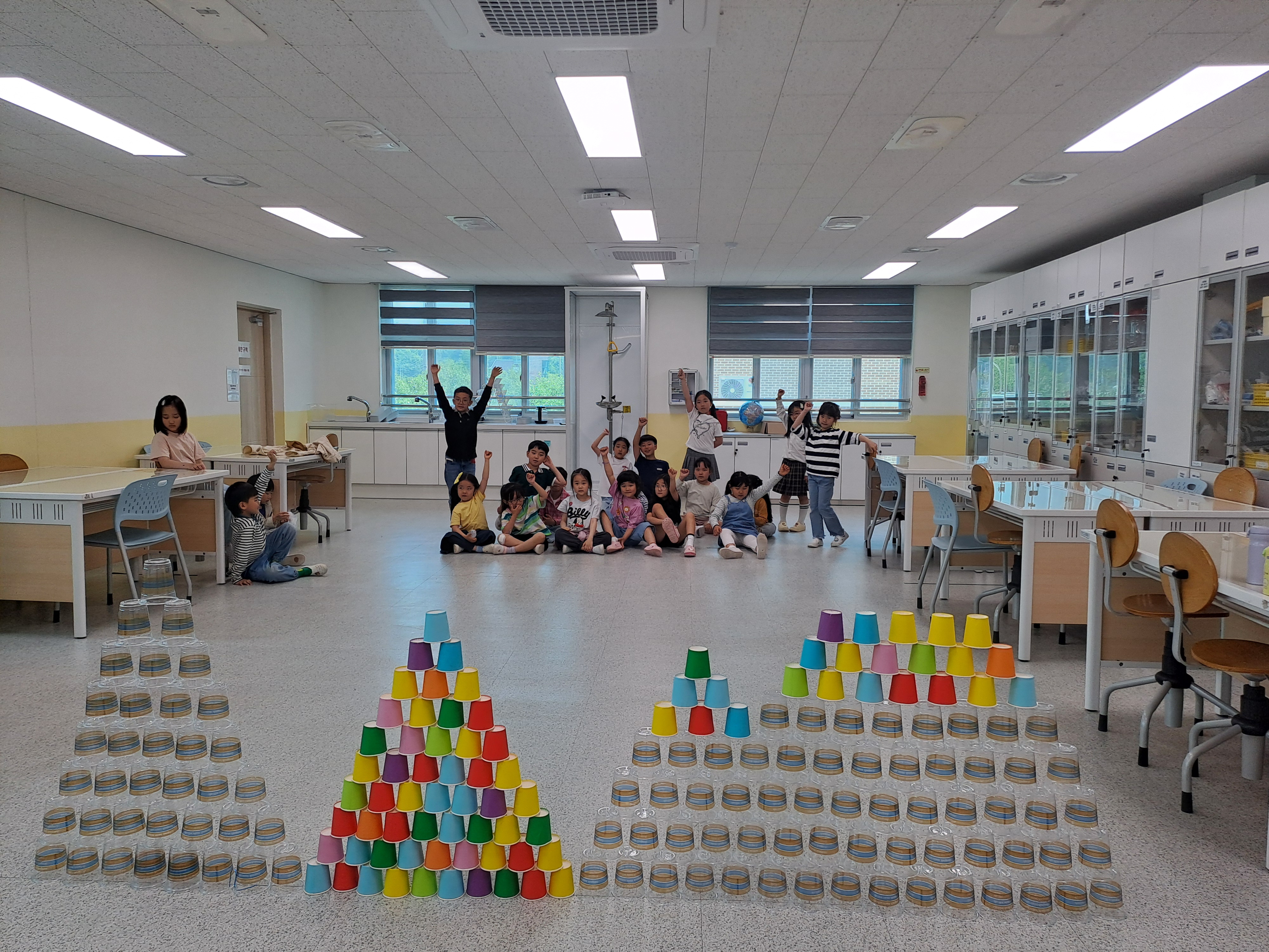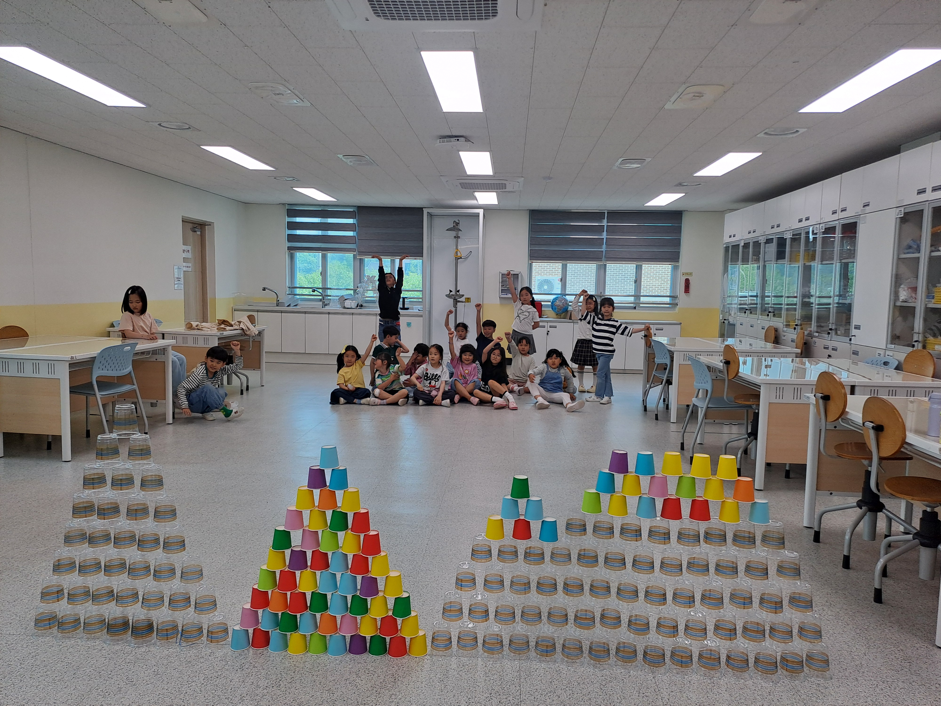 "과연 몇 개의 컵이 필요할까?" "어떻게 하면 더 빨리, 더 튼튼하게 쌓을 수 있을까?" 친구들과 머리를 맞대고, "내가 여기 잡아줄게!", "나는 이쪽에 놓을게!" 하면서 서로 협력하는 모습이 정말 보기 좋았어요. 한 층 한 층 쌓아 올릴 때마다 "와~", "거의 다 됐다!" 하는 탄성이 터져 나왔답니다. 먼저 탑을 완성한 팀이 1승을 획득하는 방식이라 더욱 긴장감 넘쳤어요!