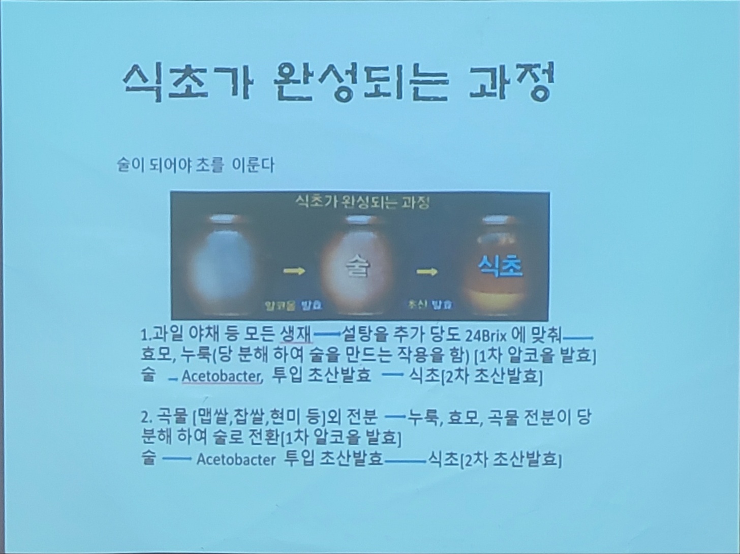 특히, 우리가 흔히 마트에서 보는 시판용 식초와 제대로 발효시킨 발효 식초의 차이점을 명확히 설명해 주셨습니다. 단순히 시큼한 맛을 내는 산도가 아니라, 우리 몸에 좋은 유기산과 효소가 풍부한 '진짜' 식초에 대한 이해를 높이는 시간이었습니다.