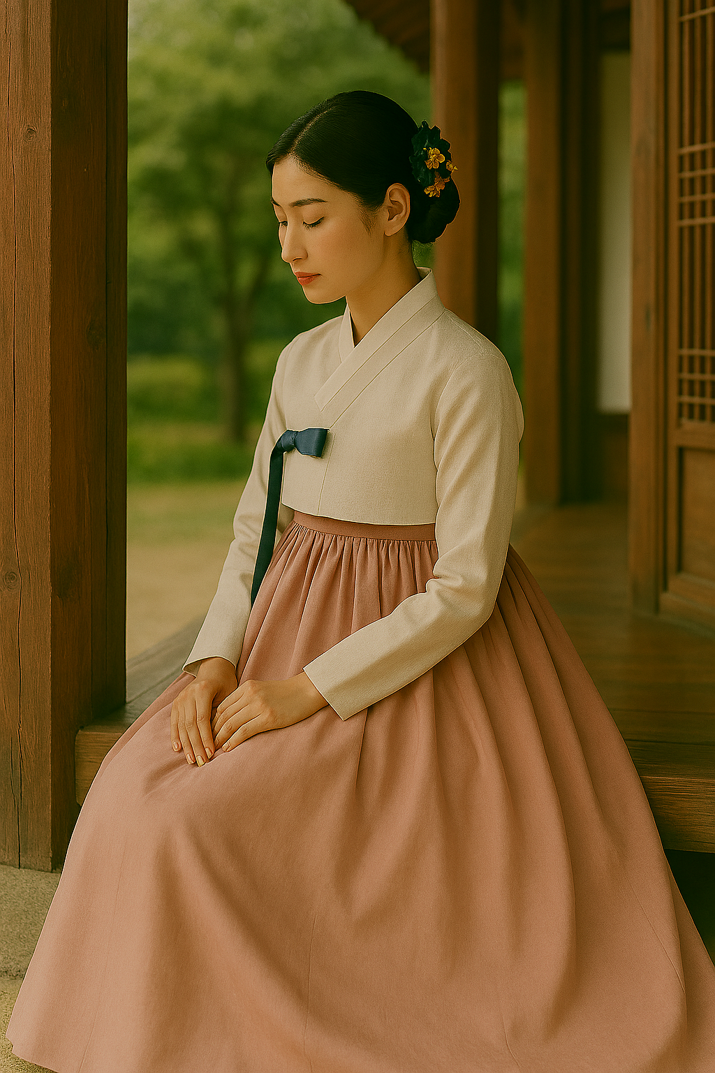 - 정자나 계단에 앉아 옆모습: 다소곳하게 앉아 한복 치마를 예쁘게 펼친 후 옆모습을 찍으면 단아하면서도 기품 있는 사진이 완성됩니다.