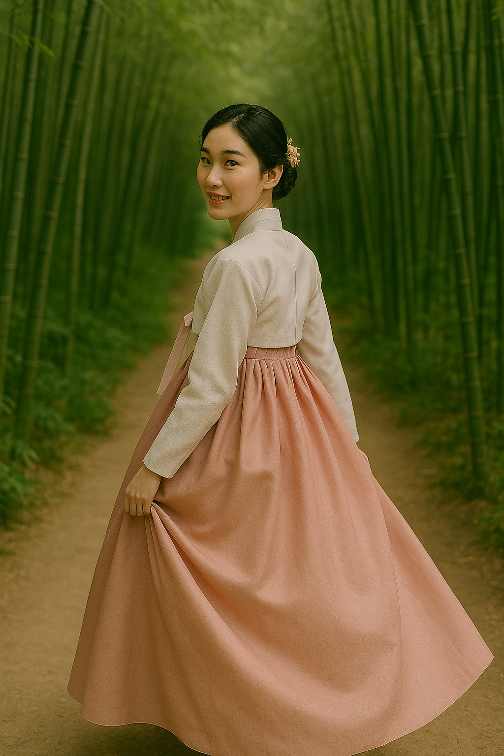 - 걷는 뒷모습 + 살짝 돌아보기: 한복의 고운 선과 풍성한 치마를 강조할 수 있는 포즈입니다. 걷다가 뒤돌아 카메라를 살짝 바라보면 자연스러우면서도 신비로운 분위기를 연출할 수 있습니다.